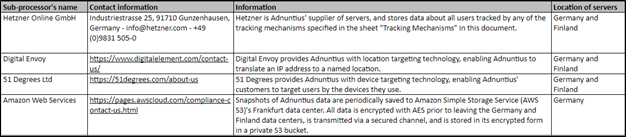 Underleverandører og lokasjon. Databehandler benytter Adnuntius AS som underleverandør. Adnuntius AS behandler Personopplysninger hos følgende underleverandører.